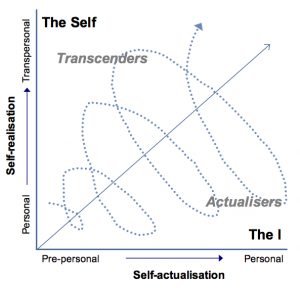 Finally, let me use my own life as a (highly simplified) example of the interplay of these two dimensions – following every appearance of outward success at school (1), I hit a crisis of identity and meaning as a young adult at university (2), that led to an inner search for truth and understanding of who I was (3), in which I embarked upon a path that led to a series of peak experiences and profound self-realisation (4), liberating me to express myself fully and experience an extended period of career achievement (5), culminating in a gradual return to self-doubt and questioning at a deeper level (6), leading me to engage in a rich period of personal and professional development (7), fuelling a new phase of actualisation in the organisational world (8), before responding to a pull towards my current work with psychosynthesis coaching, bringing inner healing and resolution (9), which I am now channelling into my courses and writing (10). Elsewhere (in the book I am writing), I will unpack this journey in a little more detail, colouring in my personal development in terms of aspirations, strengths, issues and edges during each of these phases, as well as how this translates into Assagioli’s language of personal and transpersonal psychosynthesis. For now, I simply want to show an example of how these phases illustrate cycling between periods of working on self-realisation and self-actualisation.